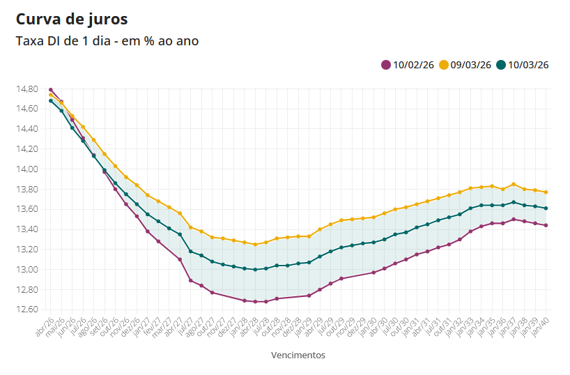 A queda do petróleo desencadeia efeitos em cadeia. Com menor pressão inflacionária esperada, investidores reavaliam as projeções para juros e crescimento económico. Esse ajuste nas expectativas foi imediatamente refletido no mercado brasileiro de renda fixa, onde os contratos de juros passaram a incorporar um cenário mais favorável para o início de um ciclo de redução da taxa básica.