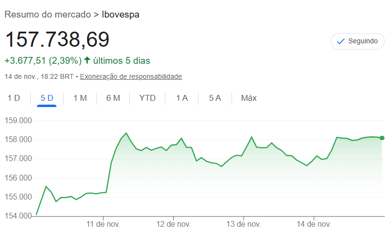 📈 Ibovespa em alta pela quinta semana: fechou com +2,39% no acumulado, aos 157.738 pontos