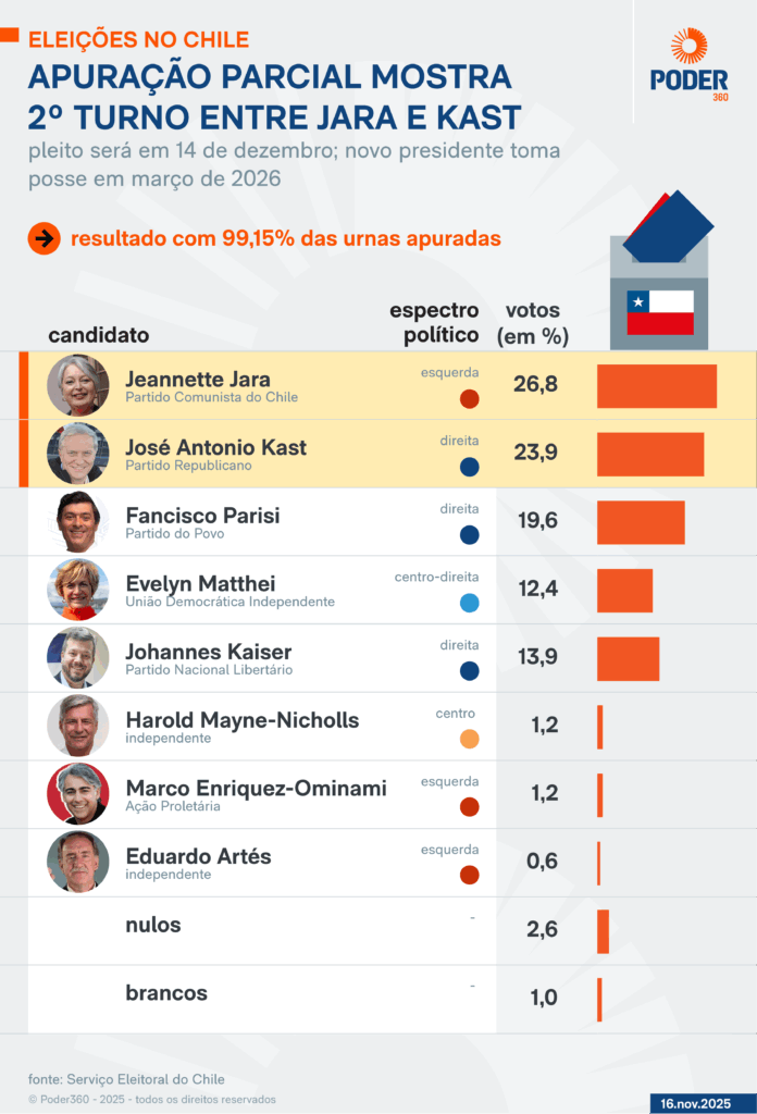 🇨🇱 Chile vai ao segundo turno polarizado: disputa entre Jeanette Jara (esquerda) e Antonio Kast (ultradireita)