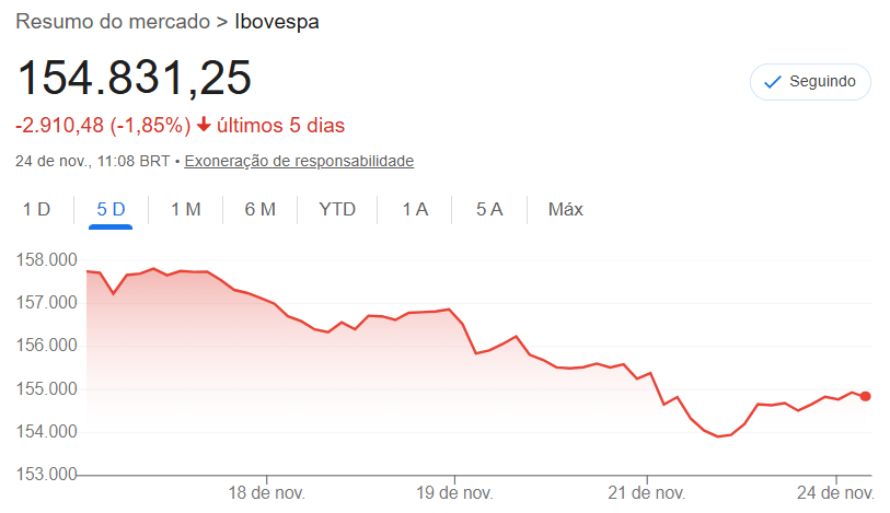 Na nossa querida Bolsa de Valores, o Ibovespa (aquele índice que junta as principais empresas do Brasil), fechou em queda. Foi a primeira vez desde o início de outubro que a gente fechou a semana no vermelho. O Ibovespa recuou 0,39%, terminando ali nos 154.770 pontos.