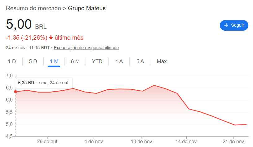 O Grupo Mateus é uma gigante rede de atacarejo (aqueles mercados que vendem em grandes quantidades) muito forte no Norte e Nordeste. As ações deles estão derretendo. Só hoje caíram mais de 2,5%, e em uma semana perderam 20% do valor.
