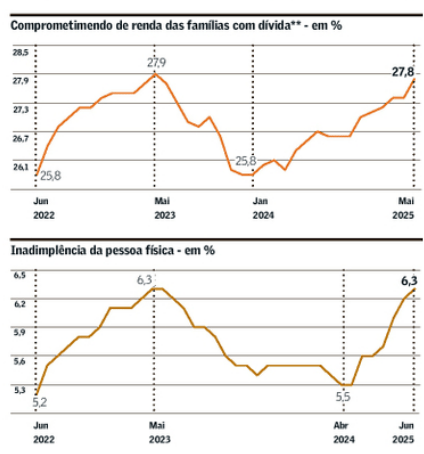🏦 Famílias endividadas: 27,8% da renda comprometida e inadimplência em alta.