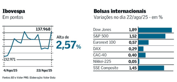 Powell deu um presente pros mercados em Jackson Hole: um discurso bem mais flexível, que abriu espaço pra pelo menos dois cortes de juros nos EUA até o fim do ano. Isso bastou pra animar bolsas no mundo todo, incluindo o Ibovespa, que subiu 2,5%, e derrubar o dólar pra R$5,42. Por aqui, as empresas brasileiras surfaram resultados fortes no segundo trimestre, com lucros agregados dobrando pra R$56 bilhões e receitas batendo R$1 trilhão. O detalhe é que boa parte desse ganho veio de redução de despesas financeiras, não só de crescimento real. E os analistas já estão de olho: tarifas externas, sanções e possível desaceleração podem tirar o brilho dessa foto bonita.