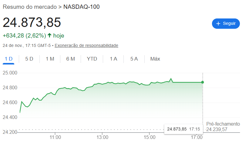 Bolsas sobem: O Nasdaq (tecnologia) subiu quase 2,70%. O nosso Ibovespa pegou carona e subiu também, fechando acima de 155 mil pontos.