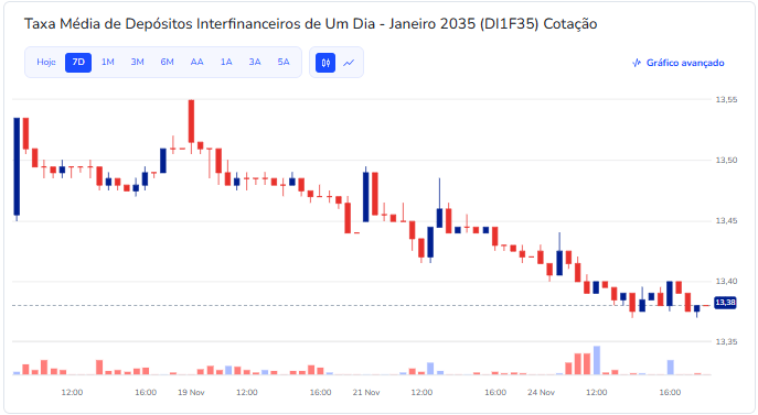 Juros futuros caem: Aqui no Brasil, a expectativa de que o dinheiro vai ficar mais barato lá fora fez as taxas de juros de longo prazo (aquelas que definem o financiamento da sua casa ou do carro) caírem. O contrato para 2029, por exemplo, deu uma bela recuada.