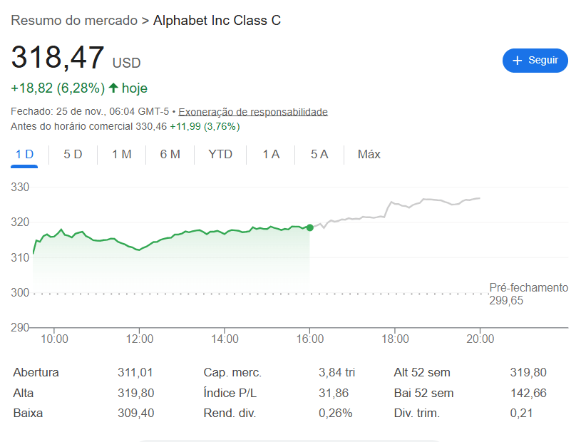 Google (Alphabet) Rumo aos 4 Trilhões de Dólares 🤖 A dona do Google está prestes a valer US$ 4 trilhões. Para você ter noção, o PIB do Brasil inteiro é cerca de US$ 2 trilhões. Ou seja, o Google vale dois Brasis. O motivo? Inteligência Artificial. O medo de que o ChatGPT ia matar o Google passou. Eles lançaram o Gemini 3, o negócio de nuvem está bombando e até o Warren Buffett investiu neles. Além disso, escaparam de ser desmembrados pela justiça americana. É uma máquina de imprimir dinheiro.