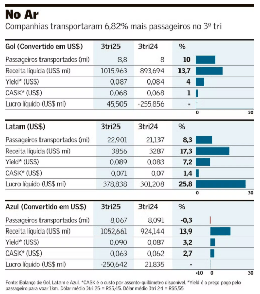 Futuro: A Latam vai trazer mais aviões e a Gol conseguiu botar as aeronaves paradas para voar. Outubro de 2025 foi o quarto melhor mês da história da aviação no Brasil. O brasileiro não desiste de viajar, nem que parcele em 12x.