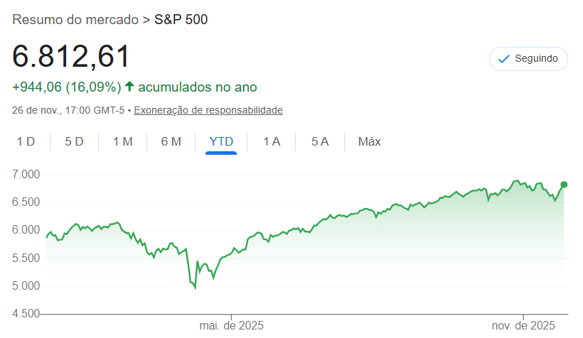 O índice S&P 500 (as 500 maiores empresas de lá) subiu 15,8% no ano. E a grande estrela continua sendo a Inteligência Artificial. Tem muita gente dizendo "ah, é bolha", "ah, vai estourar". Mas as empresas continuam entregando lucro atrás de lucro. É aquele jogador que a torcida critica, mas todo jogo faz gol.