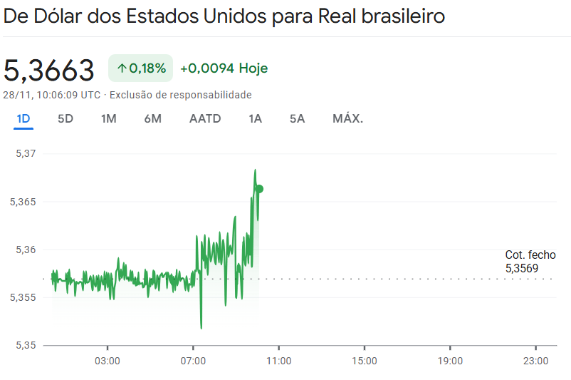 Dólar: Fechou em alta de 0,32%, cotado a R$ 5,3516. O real foi a moeda que mais apanhou entre as 33 principais do mundo hoje.