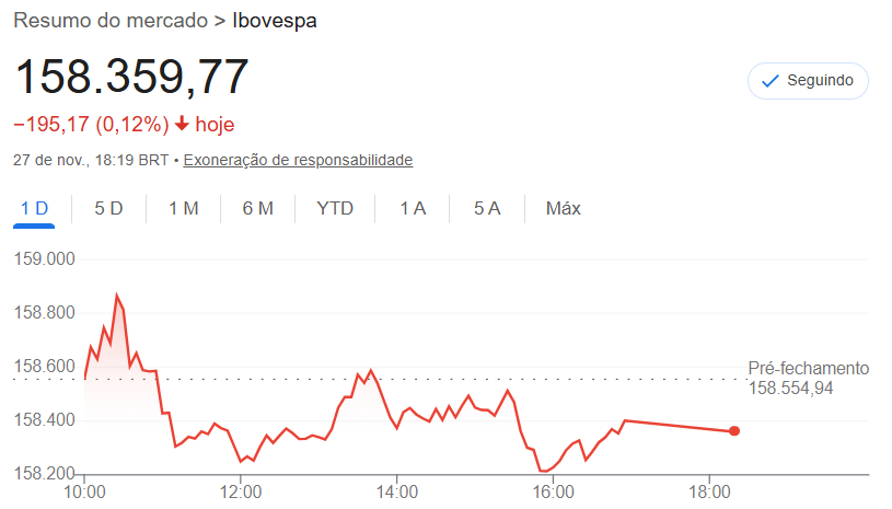 Ibovespa: Deu uma recuada de 0,12%, fechando aos 158.360 pontos. Chegou a bater recorde durante o dia, mas perdeu fôlego.